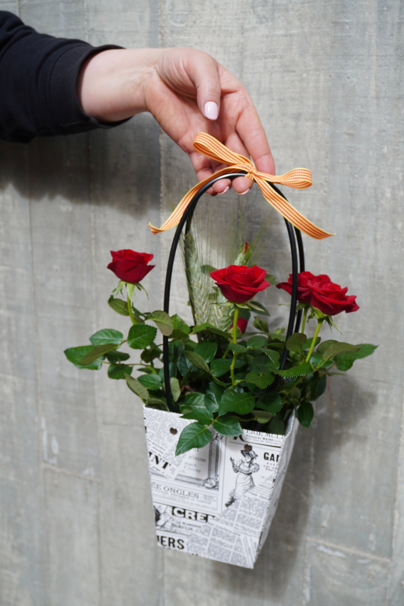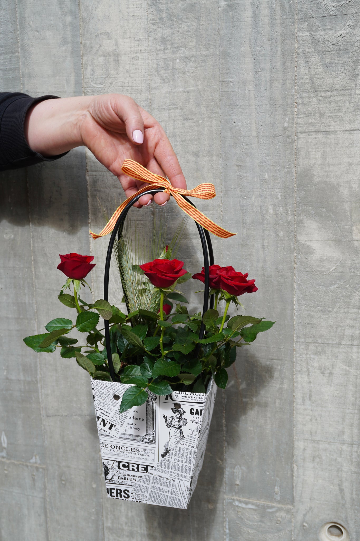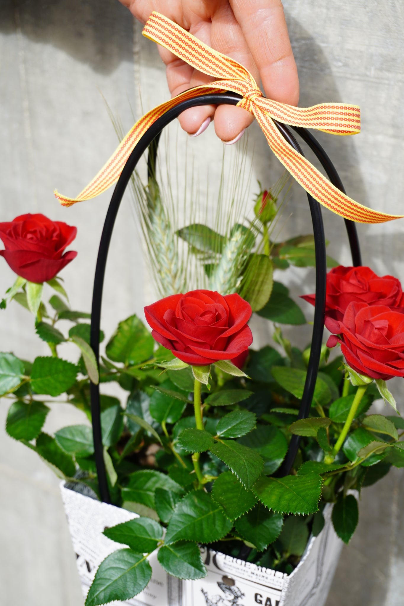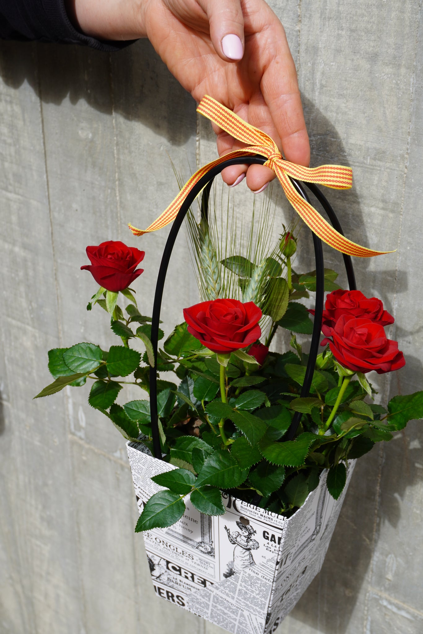 Aquest rosal pitiminí presenta diverses roses vermelles en una planta natural, acompanyada d’espigues, símbol de Sant Jordi, creant una composició amb encant i frescor. 🌹✨